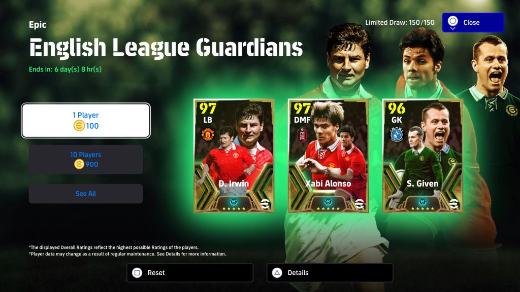 Érkeztek új játékosok is: az Engish League Guardians keretein belül a szokásos 3:150 eséllyel pályázhatunk a három legendás játékos valamelyikére! A világ valaha volt egyik legjobb jobb lábas bal oldali védője, az inkább építkező, mintsem romboló spanyol védekező középpályás és a korábban már ajándékba is megkapott (ott jóval kevesebb training XP-t kaphatott) ír portás is erősítést jelenthet sokaknak.