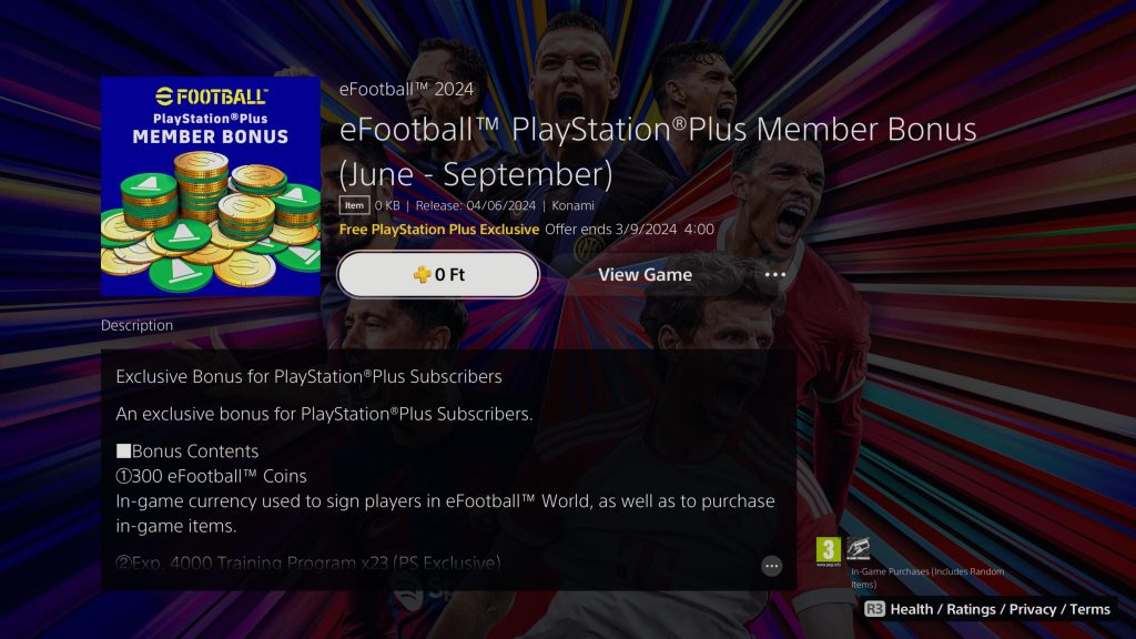 Bár a játék free to play és az online módhoz sincs szükség PS Plus előfizetésre azoknak, akik a Sony valamelyik konzolján játszanak, negyedévente mégis jár egy kis bónusz az előfizetéssel rendelkezőknek. A legújabb ilyen pack pedig tegnaptól már elérhető, csak meg kell keresni az eFootball-t a Store-ban és már be is gyűjthető a 300 Coin és 40.000 Training XP.
